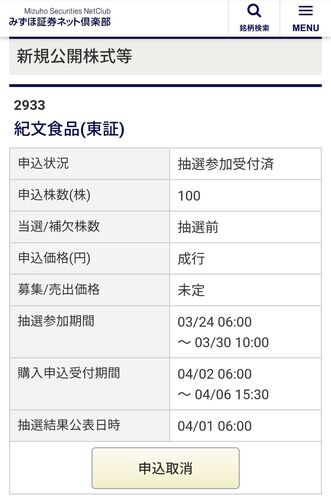 来月だと思っていたIPOが今月末までの申し込みでした 今回もみずほ証券のIPOに挑戦です! 申し込んだのは東証1部上場の紀文食品という銘柄です。 仮条件が想定よりも下がったので申し込むか悩みましたが、知名度を考えて応募に踏み切りました。 スーパーでも…