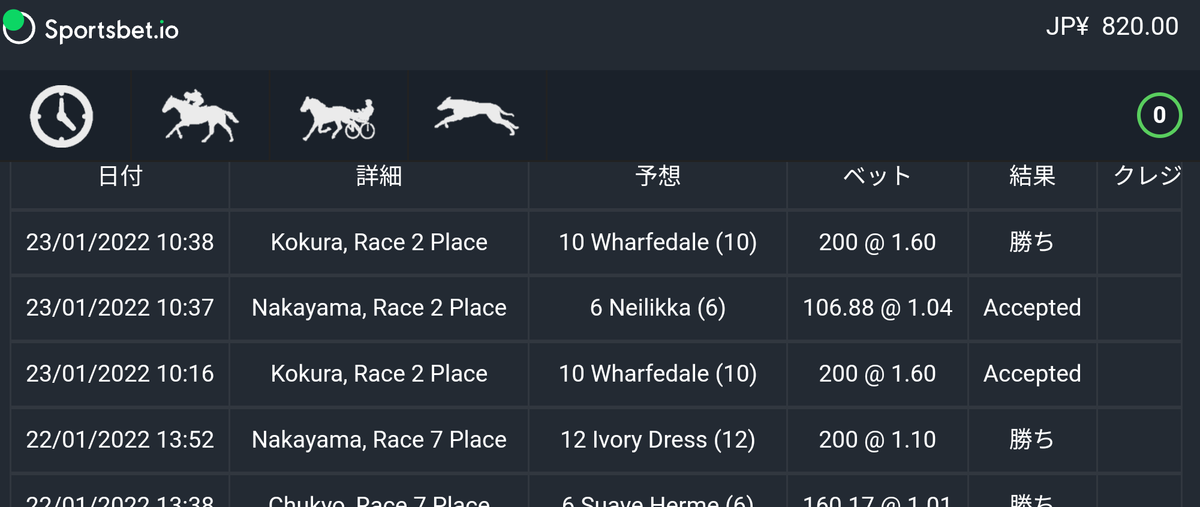 2022-01-25 結果はトントン カフジオクタゴンは快勝でしたね。見事に差し切ってくれました! しかし配当は単複1倍台と辛いものでした。 ブルベアイリーデも何とか3着。馬券内には来てくれました。 ただAJCCはオーソクレース、ポタジェともに馬券外。 オーソクレースが圏外になるとは思いませんでしたね。 前半戦もちょくちょくは買っていました。 やはり配当に良いスポーツベットアイオーが多かったですね。 JRAでは元返しだったネイリッカも1.04倍。 1.4倍だったワーフデールも1.6倍付きました😃